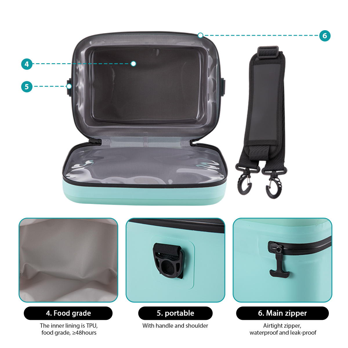 • Structure: Features insulated walls, leakproof liner, front pocket, adjustable strap, sturdy handles, and optional airtight zipper.